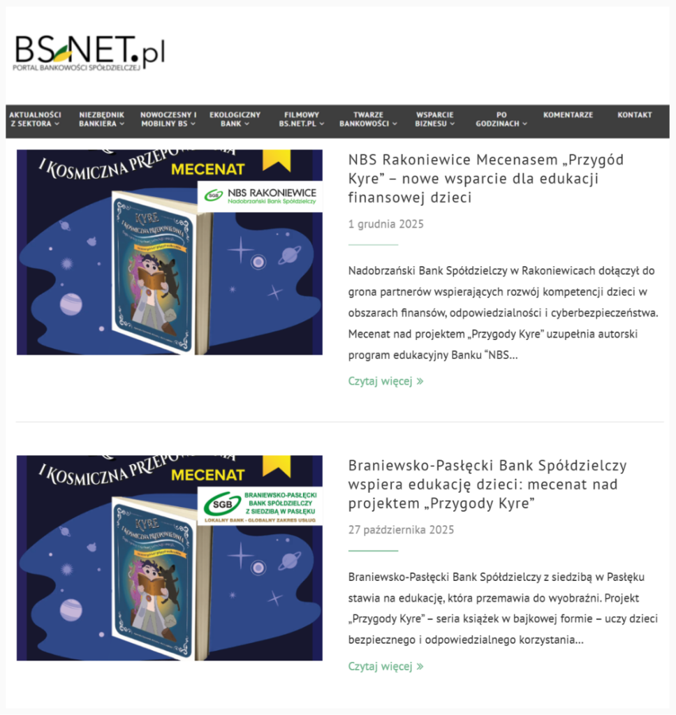 Artykuły o mecenatach Banków Spółdzielczych nad książką „Kyre i kosmiczna przepowiednia” pokazują, że inwestowanie w edukację cyfrową, współpracę i odpowiedzialność staje się coraz ważniejszym tematem w sektorze finansowym.